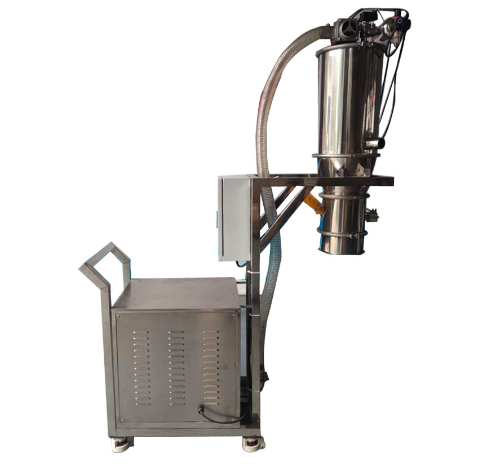 真空上料機是用真空泵抽氣,使吸料嘴進口處及整個系統(tǒng)處于一定的真空狀態(tài),粉粒料隨同外界空氣被吸入料嘴,形成料氣流,經(jīng)過吸料管到達料斗,在料斗中進行氣、料分離。分離后的物料進入受料設(shè)備。輸送、放料是通過氣動三通閥不斷地開、閉來完成的,而氣動三通閥的開閉是由控制中心來控制的。 ZKS 真空上料機中裝有壓縮空氣反吹裝置,每次放料時,壓縮空氣脈沖反吹過濾器,把吸附于過濾器表面的粉末打落下來,使吸料能正常運行。